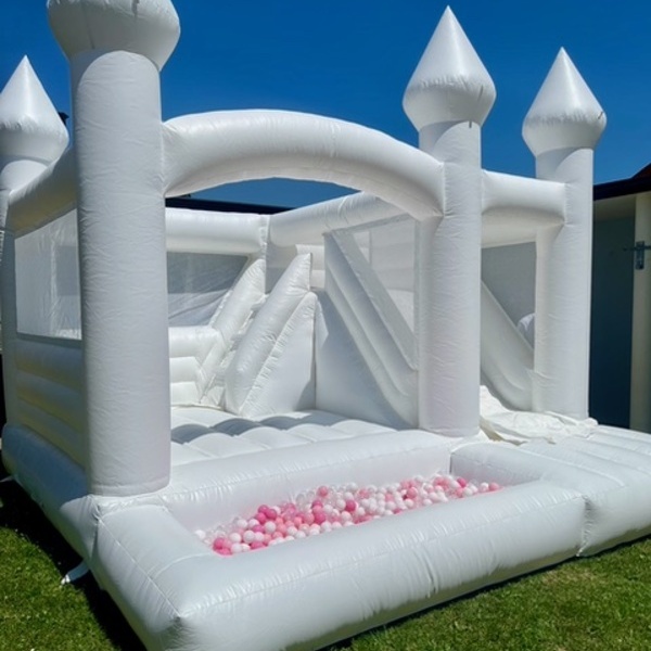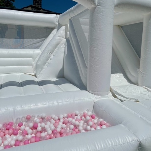 Château gonflable blanc à louer avec toboggan et piscine à balles